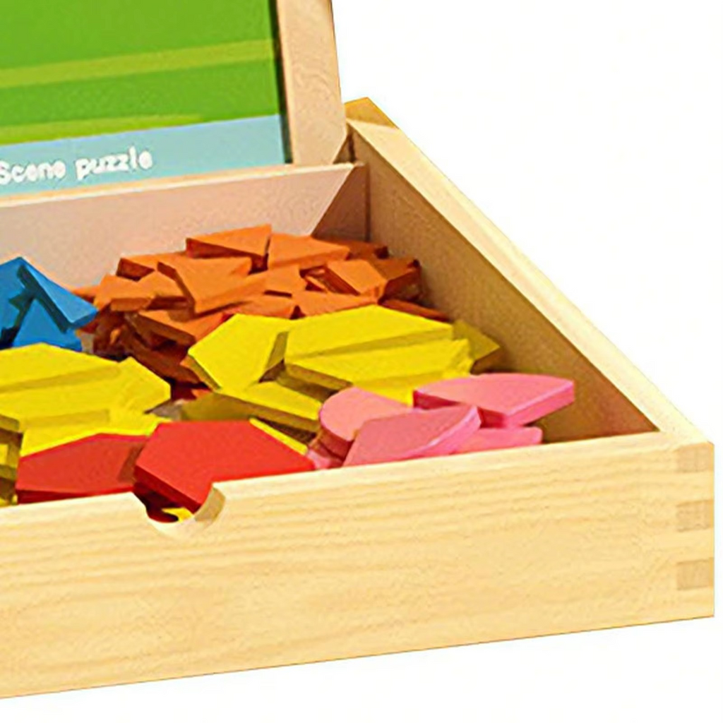 O kit acompanha cartões com desenhos e desafios, além de peças geométricas magnéticas. A criança observa a figura apresentada no cartão e utiliza as peças magnéticas para reproduzir exatamente a forma no quadro, desenvolvendo atenção e percepção espacial.