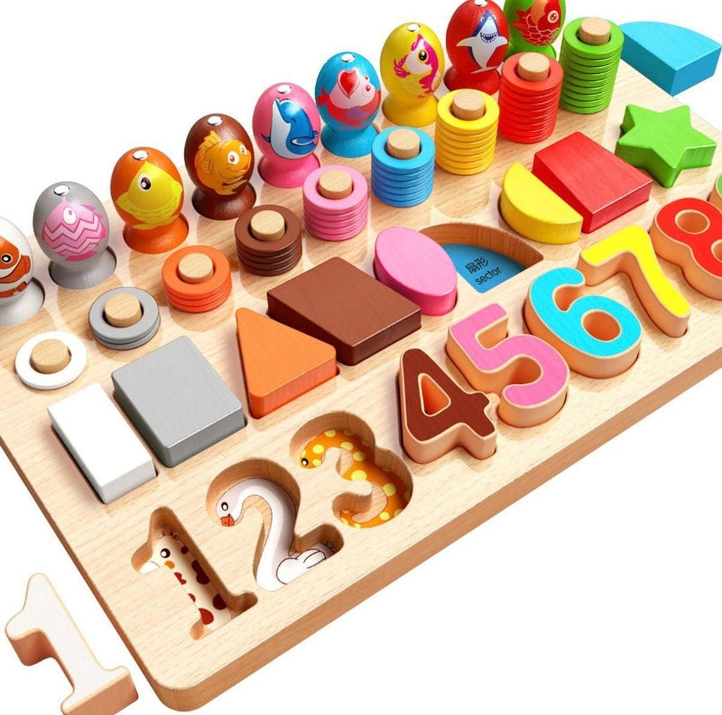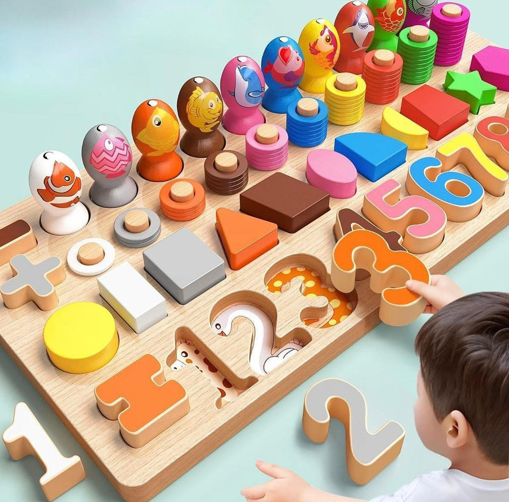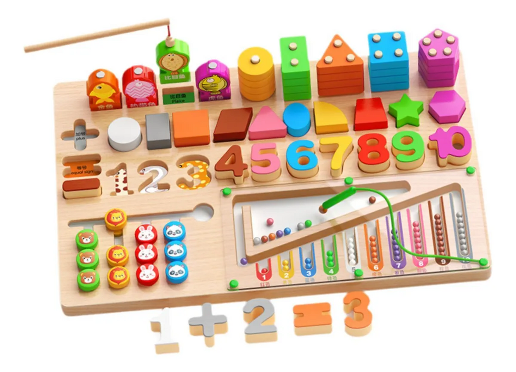 As peças de formas geométricas e números desenvolvem a percepção visual, categorização, memória visual e o pensamento espacial.