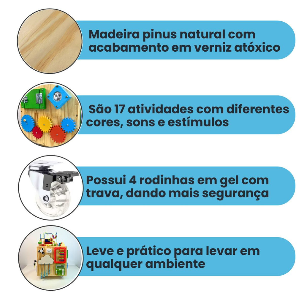 Ideal para crianças curiosas, o Mega Cubo Sensorial estimula a criatividade, melhora a coordenação motora fina, desenvolve a resolução de problemas e desperta a curiosidade natural de forma lúdica. É mais que um brinquedo: é uma estação completa de aprendizado e diversão!